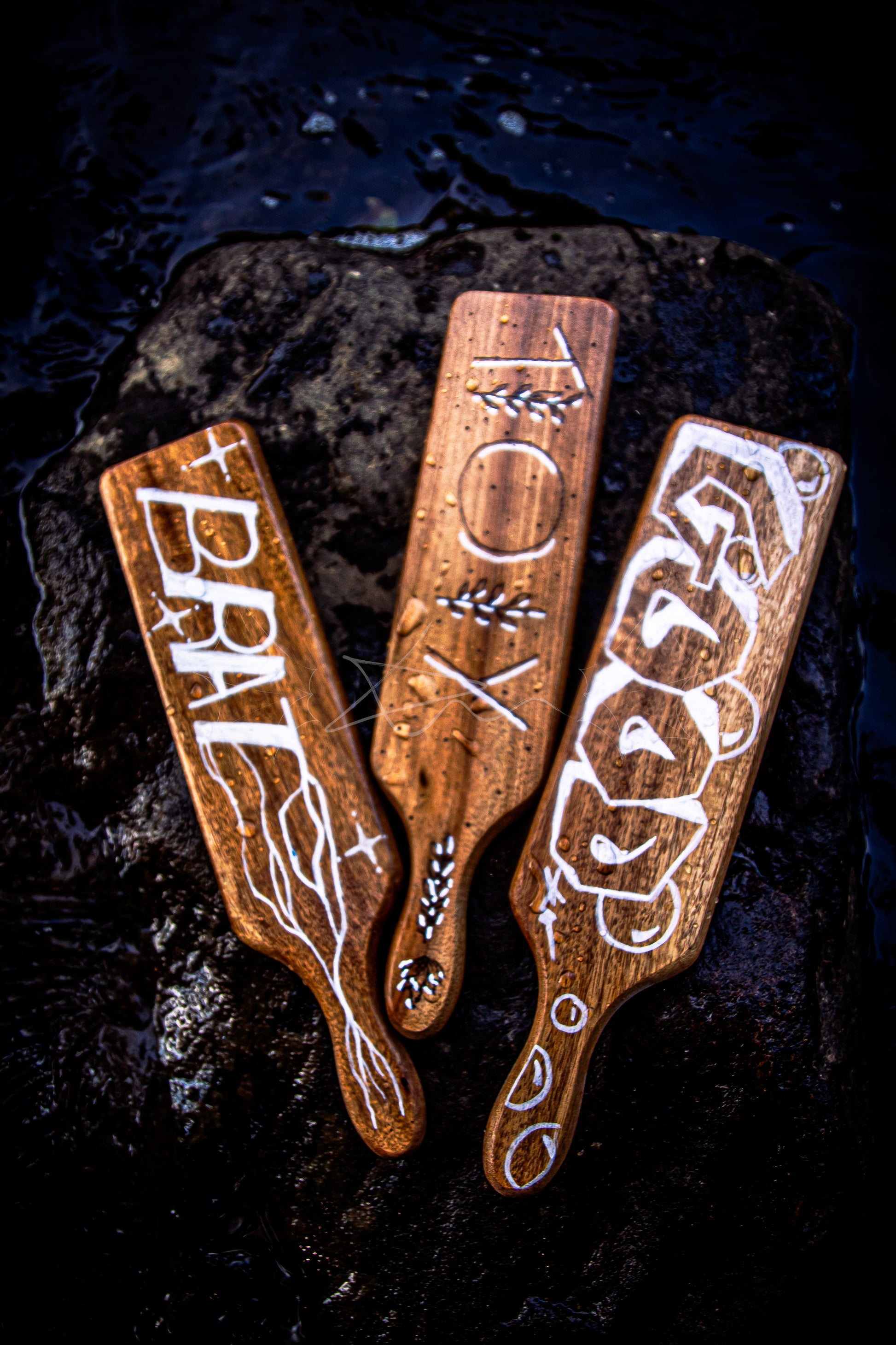 The lobby hobby is an all solid wood impact play paddle that is hand painted with different designs for your pleasure. These paddles are definitely not cheese boards and are not meant for internal consumption/use.